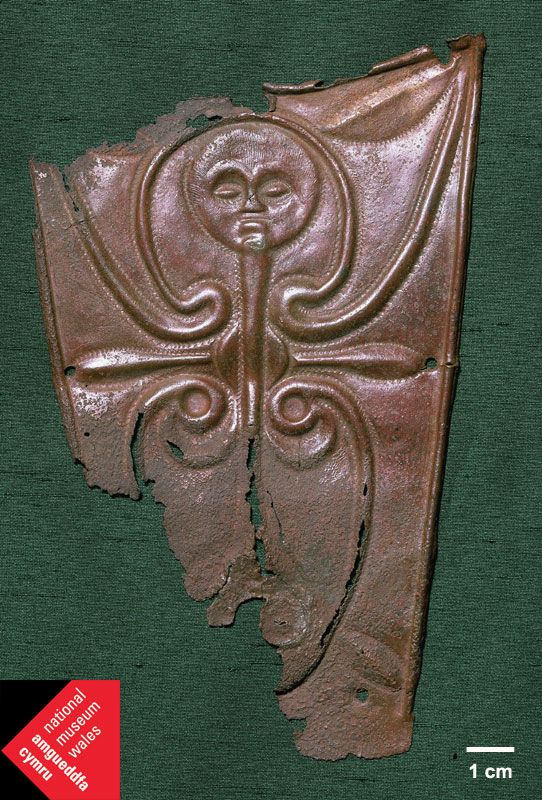 Tal Y Llyn plaque Next → One of the two trapezoidal plaques showing opposing heads within a decorative scheme. Source: National Museum of Wales