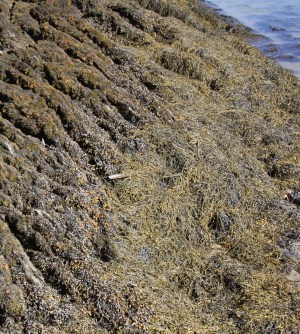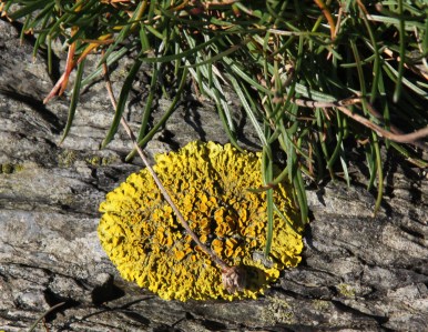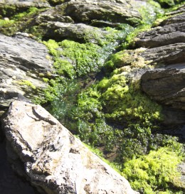 At all levels above the waterline are a variety of lichens dominated by yellow scales (shown to the right), which is prolific, followed by black shields and map lichen.  Lichens are not single organisms but are symbiotic, depending for their survival on “photobionts” (algae and/or cyanobacteria), which provide them with the carbon that they need.  The photobionts use the process of photosynthesis to manufacture their own food source, whereas the fungal component of the lichens need an external food source.  This ecological strategy has obvious benefits for the fungus, which is essentially parasitic on the photobionts, but it is thought that the photobionts might benefit too, due to the provision by the fungus of a stable environment in which they can develop.  There’s a lot more information on the British Lichen Society website.