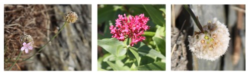 On the rock face above the level of the path, two plants in particular make the best of the most implausible nooks and crannies to grow: red valerian and sea thrift.  Both are drought resistant, saline tolerant, prefer sandy and low-fertility soils and need full sun, so are frequently found in south-facing coastal areas.  When the sea thrift goes over, which most of them have by late September, the fallen petals leave attractive skeletal globes. Watch out for sea thrift and red valerian in cracks in vertical planes of the rock to the left as you walk towards Picnic Island.  Where the rock splits it reveals trapped minerals that are often beautifully coloured providing a perfect canvas for the flowers.