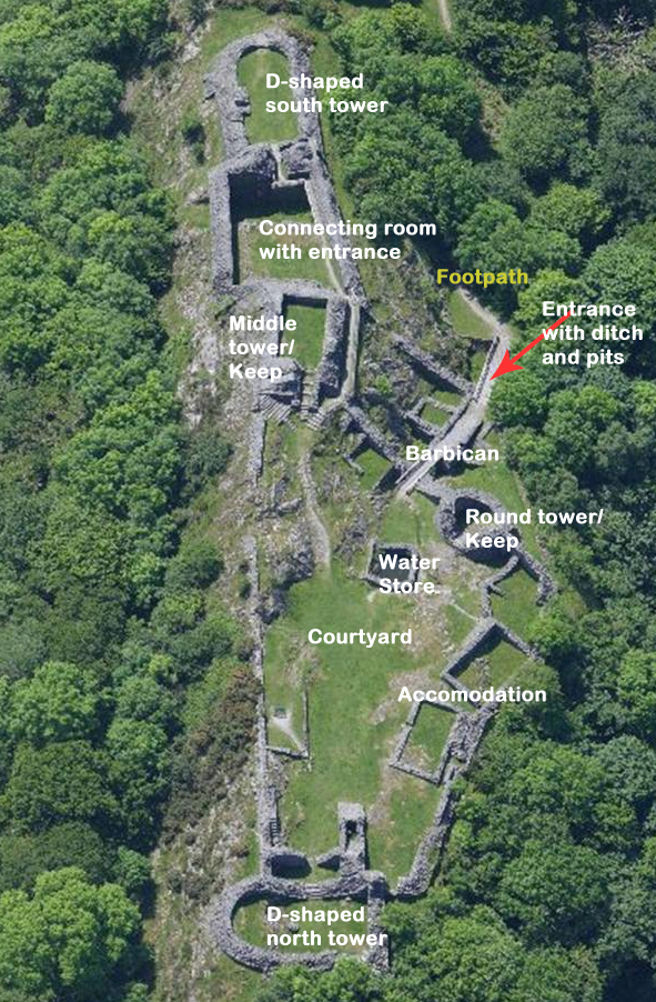 Castell y Bere aeriel photograph ← Previous Next → Castell y Bere aerial photograph with annotations showing different parts of the castle (Source: Coflein website)