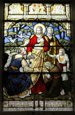 The church has five lovely stained glass windows, all dating to the late 19th and early 20th Centuries. The earliest belongs to 1872 (by Holland and Holt of Warwick) and the latest, which replaced 1872 windows in the nave, date to the early 1920s and commemorate members of the community. The themes are The Ascension (1872 by Holland and Holt); the IHS monogram, the abbreviation of the Greek spelling of Jesus, “ΙΗΣΟΥΣ” (1872, by Holland and Holt); Christ Blessing Children Brought by the Mothers (1893, Ward and Hughes); The New Jerusalem (c.1923, by Powell and Sons, designed by Ernest Penwarden), and Charity (1928). The Ascension, which dominates the church at its eastern end, is a particularly colourful and lively piece, with a depiction of the the Green Man presiding over fruit and vegetable at its base, the only known representation of the Green Man on stained glass known in Wales. The Green Man is usually a sculpture, either surrounded by or made of leaves, probably pagan in origins but frequently depicted in church sculptures, perhaps connected with ideas of earth-bound seasonal renewal and the harvest. Most of the windows are commemorative, some with inscriptions below the them, or within the glass itself. The Ascension window, for example, was dedicated to the memory of William Hodson Lloyd, who died in 1871.