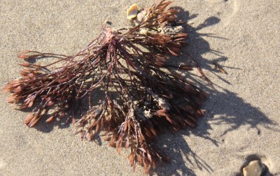 I picked up a piece of seaweed that was a deep pink when I found it, and it turned black when I left it to dry out. It’s a new one on me so I looked it up: clawed fork weed (Furcellaria lumbricalis). It only has the pods at the ends, which are its reproductive structures, in winter. It tolerates low saline conditions, so will grow even in estuary waters.