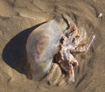 The most anomalous find was a dead barrel jellyfish (Rhizostoma pulmo), a common enough sight in warm summer months, but the first I have ever seen in winter. The barrel jellyfish is distinguished by a thick rubbery bell and “arms” rather than tentacles, which have a distinctive frill along their edges. This is a small one, but they can reach up to 1m in diameter and are the largest of jellyfish to be found in UK waters. They have a mild sting. The Marine Conservation Society collects sightings of jellyfish (and turtles, crawfish and basking sharks) throughout the year, so if you see one it is worth going to the MCS’s sightings page and filling in their online form. There’s a good jellyfish identification guide on the IWS website, from which the following is taken: