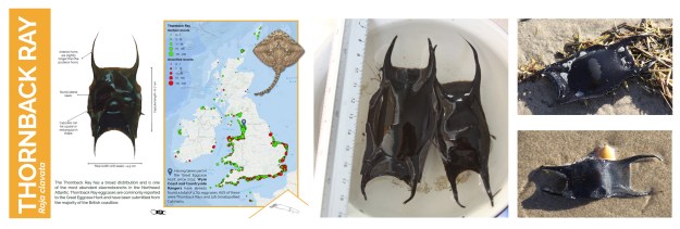 I also found two new eggcases. If you are new to eggcases, have a look at my post on the subject, where I go into some detail. These were very unlike the nursehound case that I found on the beach that day, but very distinctive. Using the Shark Trust’s identification guide, it was possible to narrow them down to a Thornback Ray (Raja clavata) and a Spotted Ray (Raja montagui). My photos of the two cases are below, together with the Thornback Ray relevant page from the Shark Trust’s identification guide.