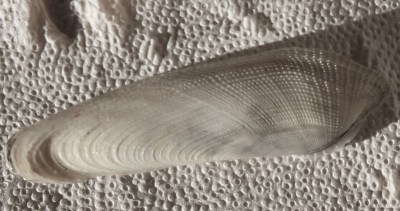The bivalve shell I picked up and kept is neither unusual nor relevant to any conservation programmes, but it is simply very attractive, with a wonderful textured surface, and I had never seen one before. It’s a common piddock (Pholas dactylus), one of four species of piddock found mainly in the south and wet of Britain, all white. They are specialist borers, using the ridges for drilling into hard substrates to create burrows. They have feeding siphons which reach out from the burrow into the sea to collect nutrients, and in the case of the common piddock the siphons are bioluminescent and glow green in the dark. Shells can be up to 12cm long, and this one is exactly 12cm long.