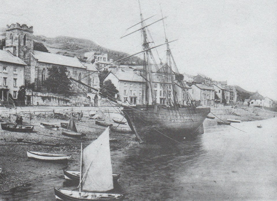 St Peter’s overlooking the foreshore with the schooner Sarah Davies, 1902. Source: Gwyn Briwnant Jones, Picturesque Aberdovey: A Collection of 20th Century Postcard Views. Gomer 2000.