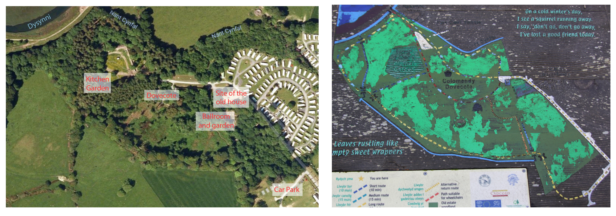 On the right is a noticeboard showing the walks, which are positioned at strategic places around the woodland. I have annotated a Google map on the left with approximate locations of some of the features. The porch of the servants and admin quarters is to the right of the ballroom, minus the Corbet coat or arms, which was spectacular and one does wonder where it went.