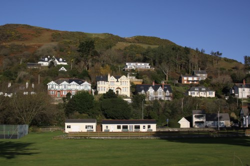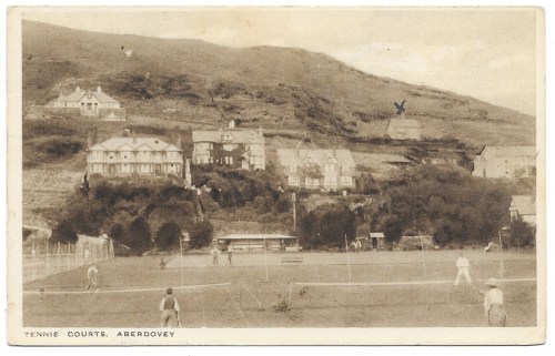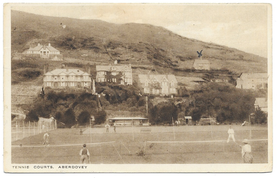 The tennis courts were located in front of the approach to Aberdovey railway station. Now, it’s a bowling green, with a small section fenced off to the left that still has a tennis court. The little tennis pavilion has now been replaced by two slightly larger structures. It is possible that the blue X marks the house where the visitors were staying. My excellent uncle occasionally does the same thing in the postcards he sends. The houses in the postcard and my photographs below shows how foliage can change aspects of a scene. The house at top left now has a tree in front of its central gable, and the one immediately above the tennis pavilion previously had Virginia creeper or similar clinging to the walls, which has now been stripped off. There are a couple of new buildings in the picture below, but on the whole that stretch of Aberdovey retains most of its character.