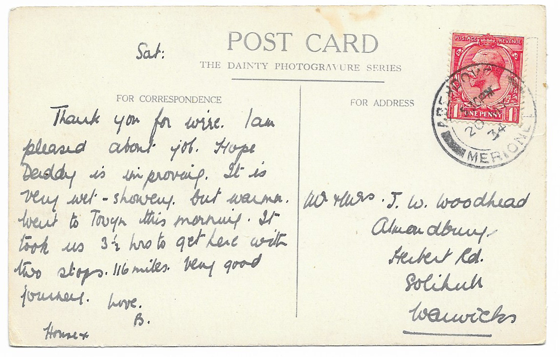 The bowling club was established in 1921. The postcard was sent to Solihull in 1934, with an Aberdovey Merioneth postmark. The stamp is a George V 1d red that was issued between January 1st 1912 and 1934. I’ve seen an identical postcard with the postmark dated 1926, so this postcard had obviously been in circulation for some time.