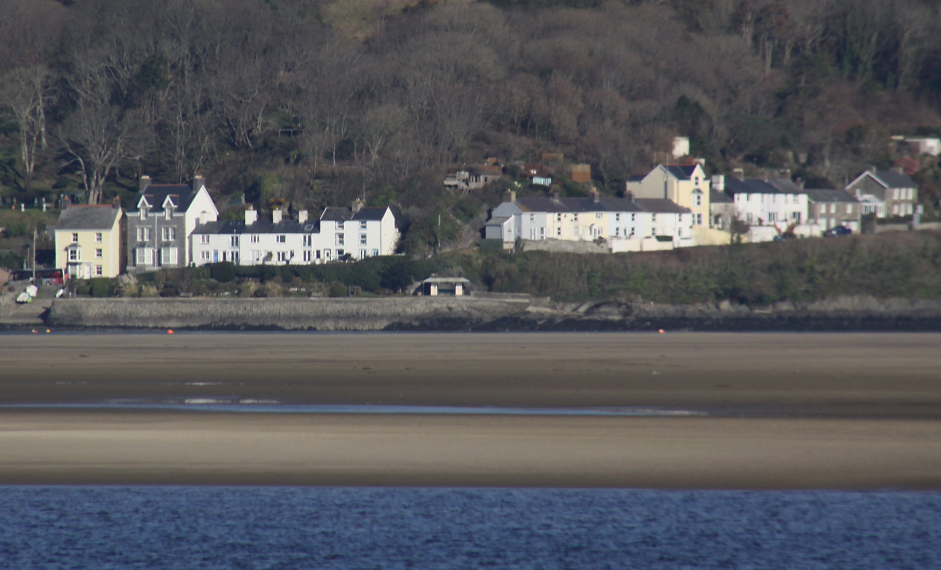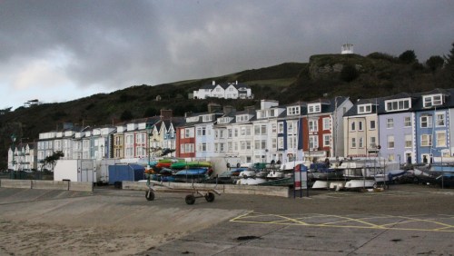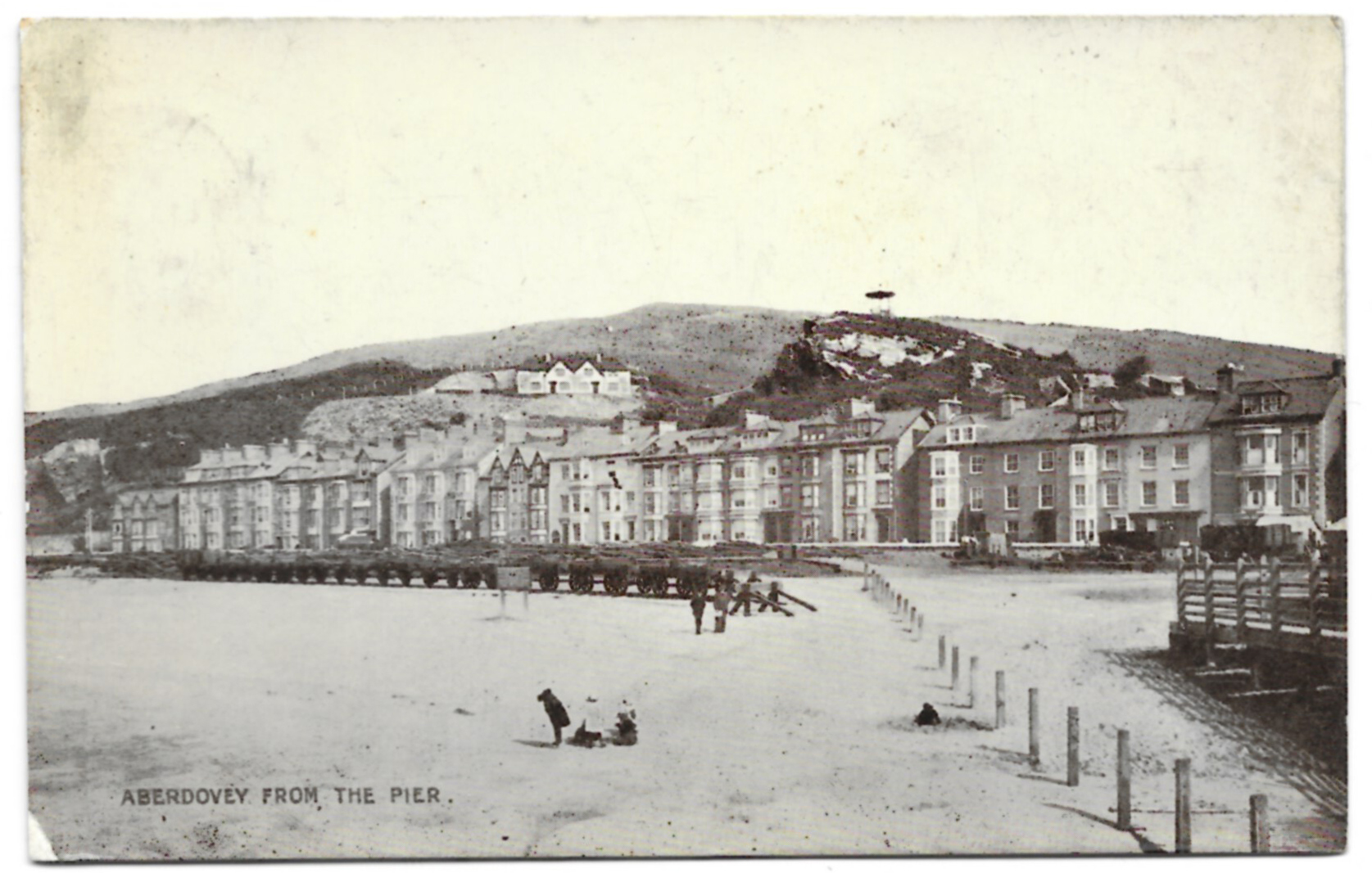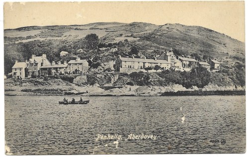 Where the big 1970 car park is now located, railway tracks used to cross the beach in front of Glandyfi Terrace. There is more about the rails and the jetty in an earlier post, and there isn’t much else to say about this postcard here, but I like it very much. The row of freight trucks with their big wheels divides the tourist beach from the houses, and tell their own story about the various economic imperatives of Aberdovey in the earlier 20th Century. As ever, the 1897 shelter on Pen Y Bryn looks out over the scene, the village’s most conspicuous landmark and one of it’s most visited tourist attractions. The photograph was taken from the jetty and I have tried to reproduce the same viewpoint.