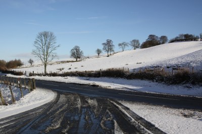 In the part of the bar north-west of the river, the surface is moundy, but smoother and in clean pasture except for gorse patches on the mound summits. There is almost everywhere a complete turf cover but immediately underneath, on each mound top, are closely packed angular mudstone fragments similar to the debris found immediately overlying rock. That the smooth fields could lie on rock is proved by the road-side exposures north-west of the church. Occasional scars on tracks show rock or angular rock debris while three shallow pits dug to a depth of 18 inches showed the same rock debris on the slope bounding the bar to the south-west. On the slope behind Maes-y-pandy Farm, rock with varying cleavage direction is exposed.