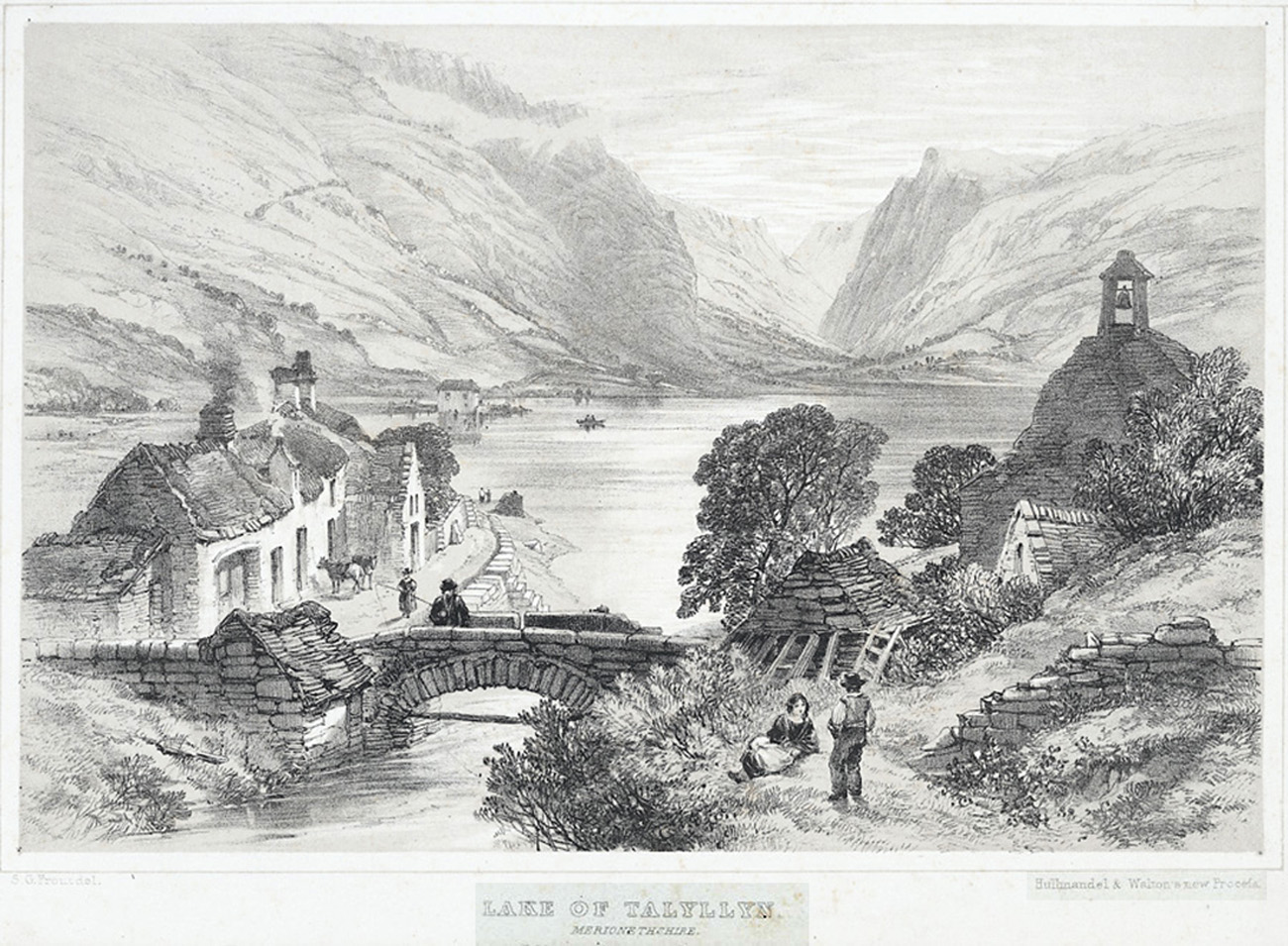 The foot of the lake opens out into the Afon/River Dysynni at the Pen y Bont hotel, through the landslip. It is crossed by the B4405 between the Pen y Bont hotel and St Mary’s church. The bridge is a very different affair from the one shown in this picture dating to the first half of the 19th Century. The river wends its way through its floodplain, along the fault line, as far as Abergynolwyn, where it joined by the Nant Gwernol and turns away from the fault line, instead heading to the northeast before again changing direction with a turn into the Dysynni valley (Dyffryn Dysynni), where it is joined by Afon Cadair before resuming its southwestern course parallel to the fault line.