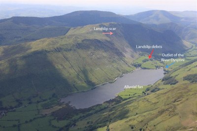 Photograph of Tal y Llyn, annotated to show the landslip scar and some of the debris that blocked the glacial trough, allowing the ribbon lake to form. Source: Coflein, catalogue number C868164