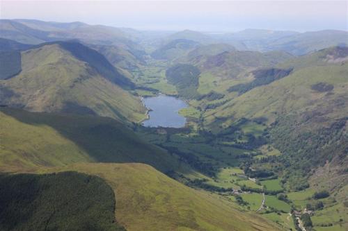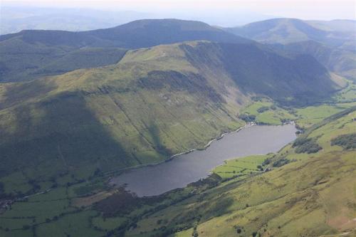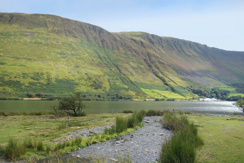 These streams pass through a large flat area of green fields used for grazing, that becomes brownish boggy marsh where it meets the lake, shown very clearly in the photograph to the right. This flat zone is the result of a build-up of alluvium dropped by steep and hanging streams, and is still expanding into the lake. The alluvial flats are created by the sudden slowing of the water as it hits the valley floor, a common feature with hanging valleys, where water drops sharply down a hillside. As soon as water stops falling and hits the flat valley surface, it slows down and instead of carrying material downstream, it drops it. The heaviest particles are dropped first, with lighter components dropped further downstream, and slowly these built up to form an alluvial plain. Where streams drop particularly steeply towards a river or lake, this effect is exaggerated.