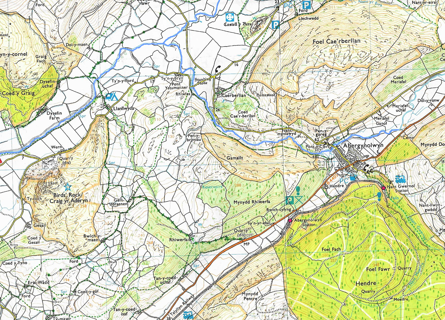 Ordnance Survey Explorer Map OS23 showing the path of the river Dysynni as it changes course, having flowed out of Tal y Llyn to the northeast. I’ve loosely sketched the path of the course change in a deeper blue so that it can be seen more clearly.