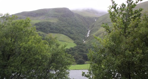 A stream plummeting down Cwm Amarch, above Pentre Farm, on the northeast side of the lake on a very rainy day in late June 2020