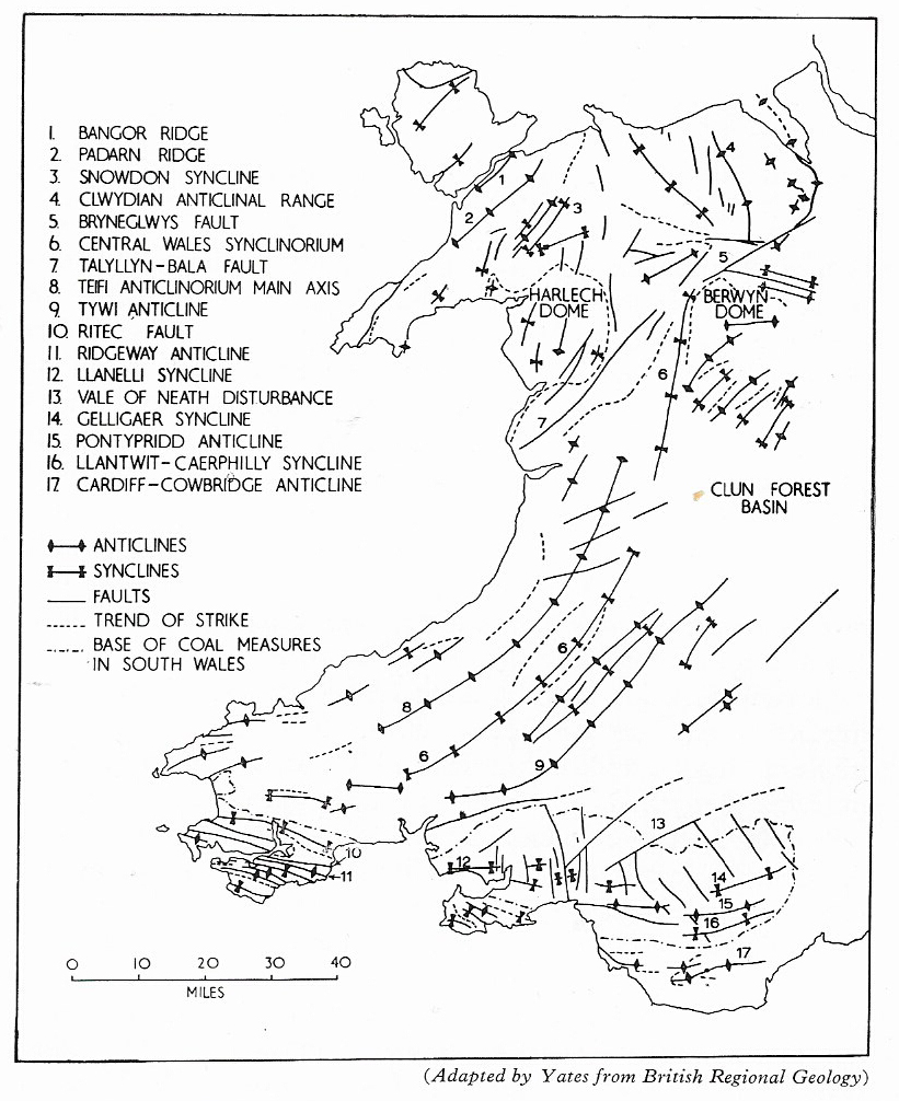 Map of main structural elements of Wales, showing the Bala Fault (no.7). Source: Howe and Thomas 1963, p.xiv