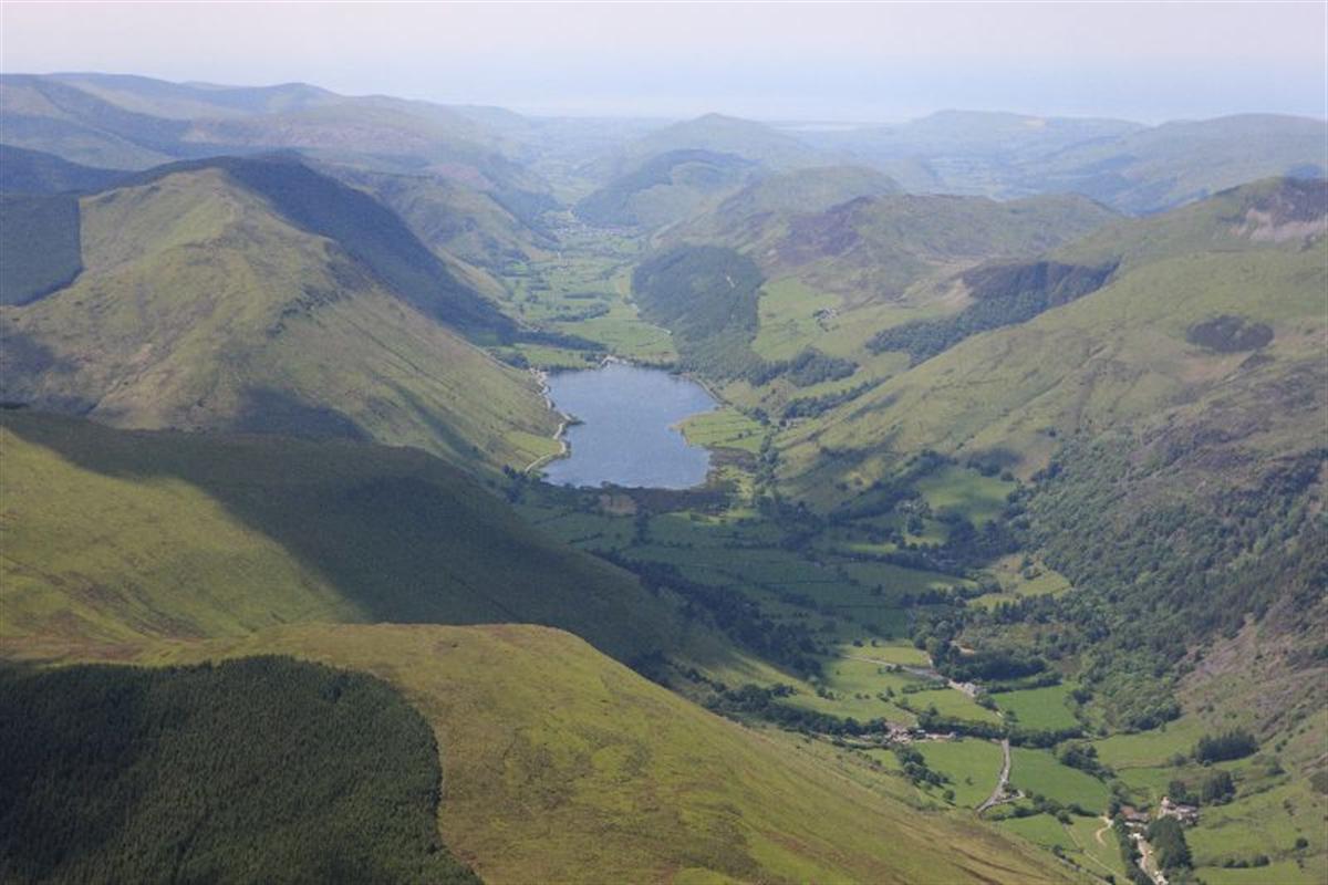 Dramatic, informative and very beautiful aerial view towards Tal Y Llyn in the background at the northwest with Abergynolwyn clearly visible as a white strip of buildings to the south of the lake, with part of the village hidden behind the large tree-covered spur (Mynydd Rhiwerfa) that intrudes into the valley. The river turns westwards before the spur at Abergynolwyn. The B4405 continues down the former river valley, following the line of the fault. The tiny cluster of white buildings in the foreground is Dolgoch. Nant Dolgoch flows into the Afon Fathew, which in turn flows into the Dysinni near Bryncrug, not far from the river’s mouth. Source: Coflein, catalogue number C821258
