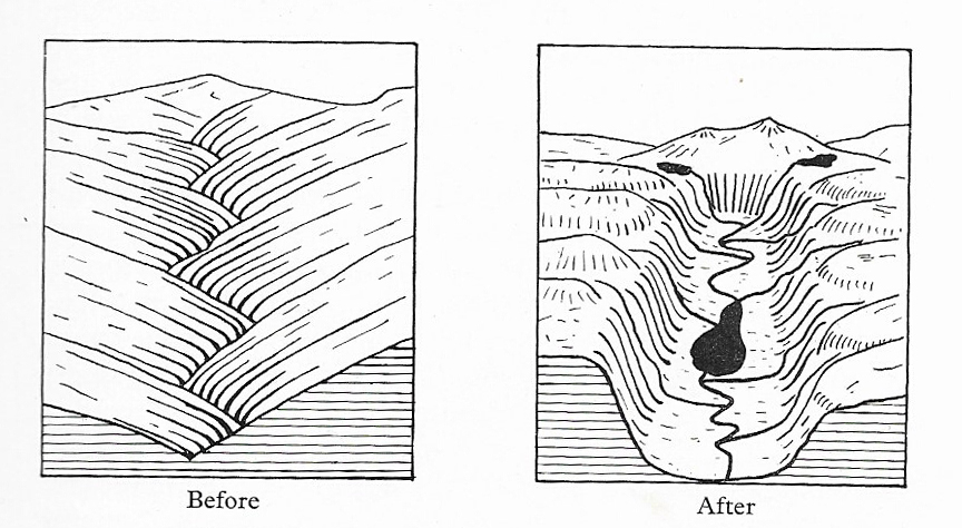 These faults are tear or transform faults and occur when two pieces of the earth’s crust are moving horizontally relative to each other. The resulting faults formed a lineament, a natural line for water to follow. Over time, water courses carved out a series of valleys along the Bala lineament.