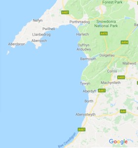 Mid-West Wales showing the locations of Aberdyfi (or Aberdovey), Tywyn, Borth, Machynlleth, Aberystwyth, Corris and Barmouth, key places in the story of coastal and deep sea trade and boat- and shipbuilding. Google Maps.