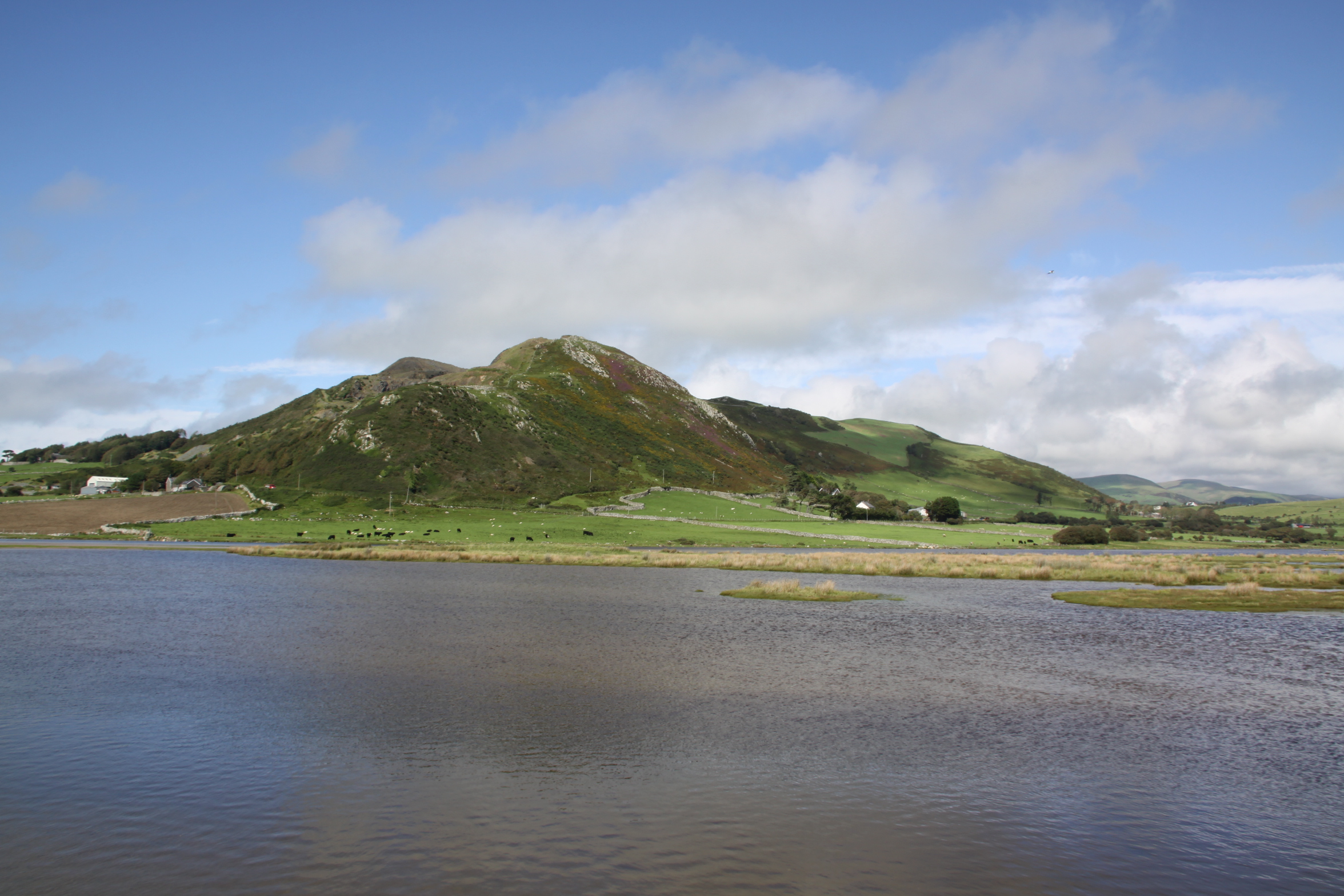 Craig yr Aderyn, which translates as Rock of Birds, or more usually Bird Rock, is a major local landmark, abutting the of the Foel Wyllt hill ridge overlooking the Dysynni valley from the south. The course and character of the river Dysynni have changed over time.  Before the 18th century the estuary reached almost to the foot of Craig yr Aderyn, but the river silted up and is no longer navigable.  The land has been drained since the 1700s to create better quality land for farming, although standing looking down from the summit, it is quite clear that the land to the west still has some very boggy patches marked by beds of spiny rush (Juncus acutus), which is found in all freshwater flats, bogs and marshes herabouts.  It is not known what it looked like in prehistory, but the presence of a glacial valley with Cadair Idris at its back indicates that a melt-water river certainly passed Craig yr Aderyn on its way to the sea, and this will have established a valley route into which later hill drainage descended.  It would be useful to know what it was like during the Iron Age.