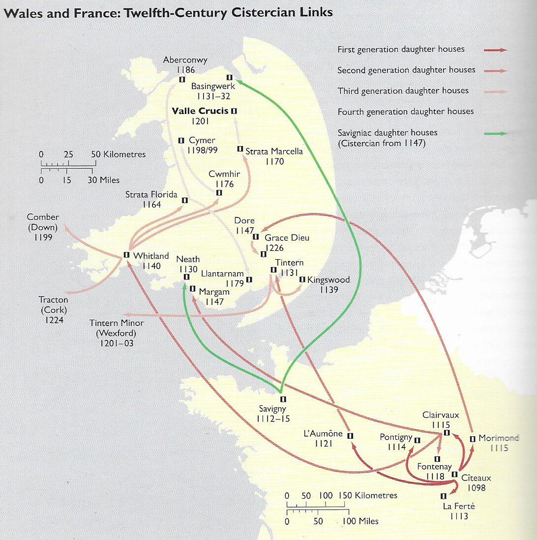 12th Century links between Cistercian monasteries. Source: Evans, D.H. Valle Crucis Abbey (Cadw). Although Citeaux, the node for all Cistercian abbeys, established early new bases in France, it was Clairvaux under the lead of St Bernard that was responsible for the earliest new abbeys in Wales. Of these Whitland was the most important for the northward spread of monasticism. The green lines emanating from Savigny reflect the Savignac order, which merged with the Cistercians after only 20 years, in 1147. So although Basingwerk in the north and Neath in the south were founded as Savignac orders, after 1147 they were brought under the rule of the Cistercians at Citeaux.