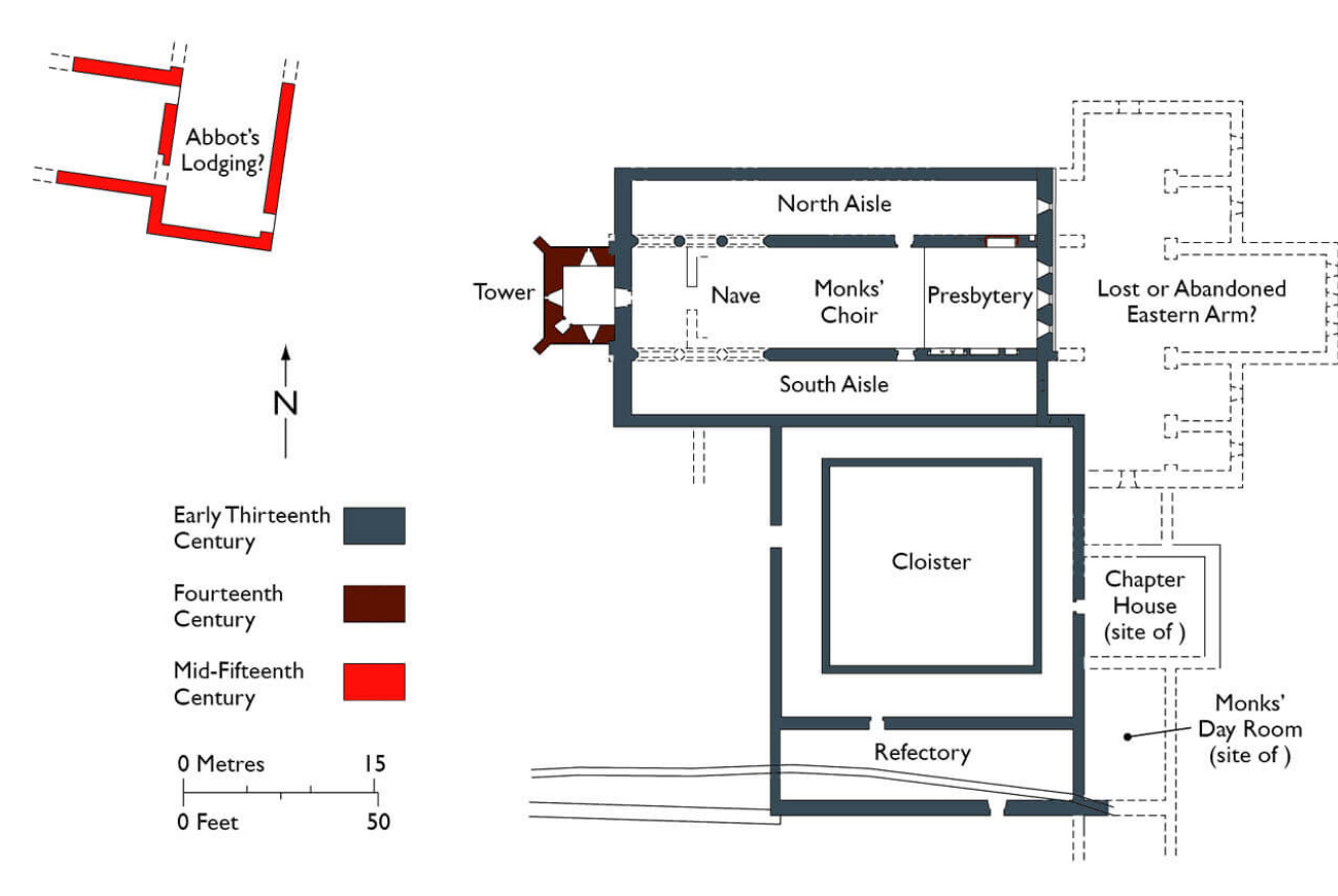 Cadw site plan showing the surviving stonework in grey and brown, and the possible abbots lodging, as well as the missing section of the abbey