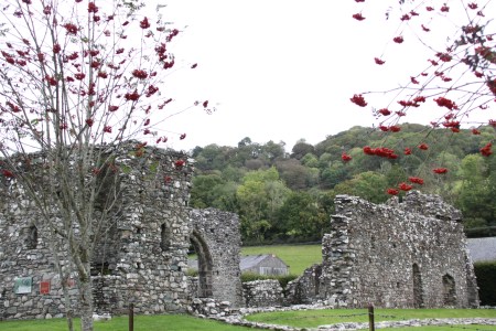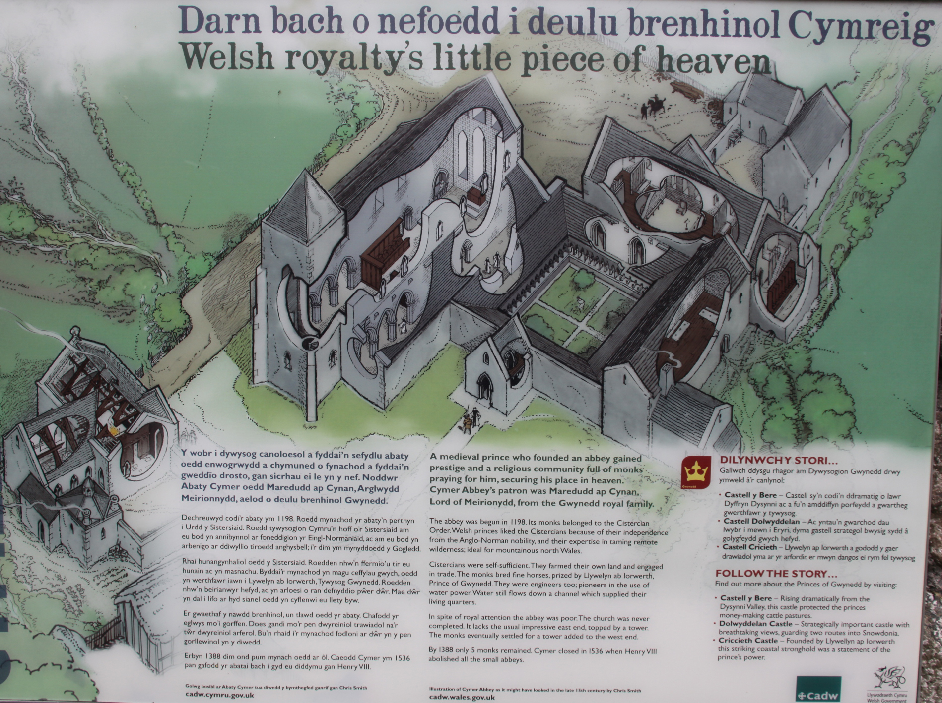 Cymer Abbey is easy to reach. It lies just off the A487 north of Dolgellau and is well sign-posted. After driving through a small caravan park, there are two very attractive farm buildings, and a small parking area. Both parking and access to the abbey ruins are free of charge. There is an information board showing the main features of the abbey.