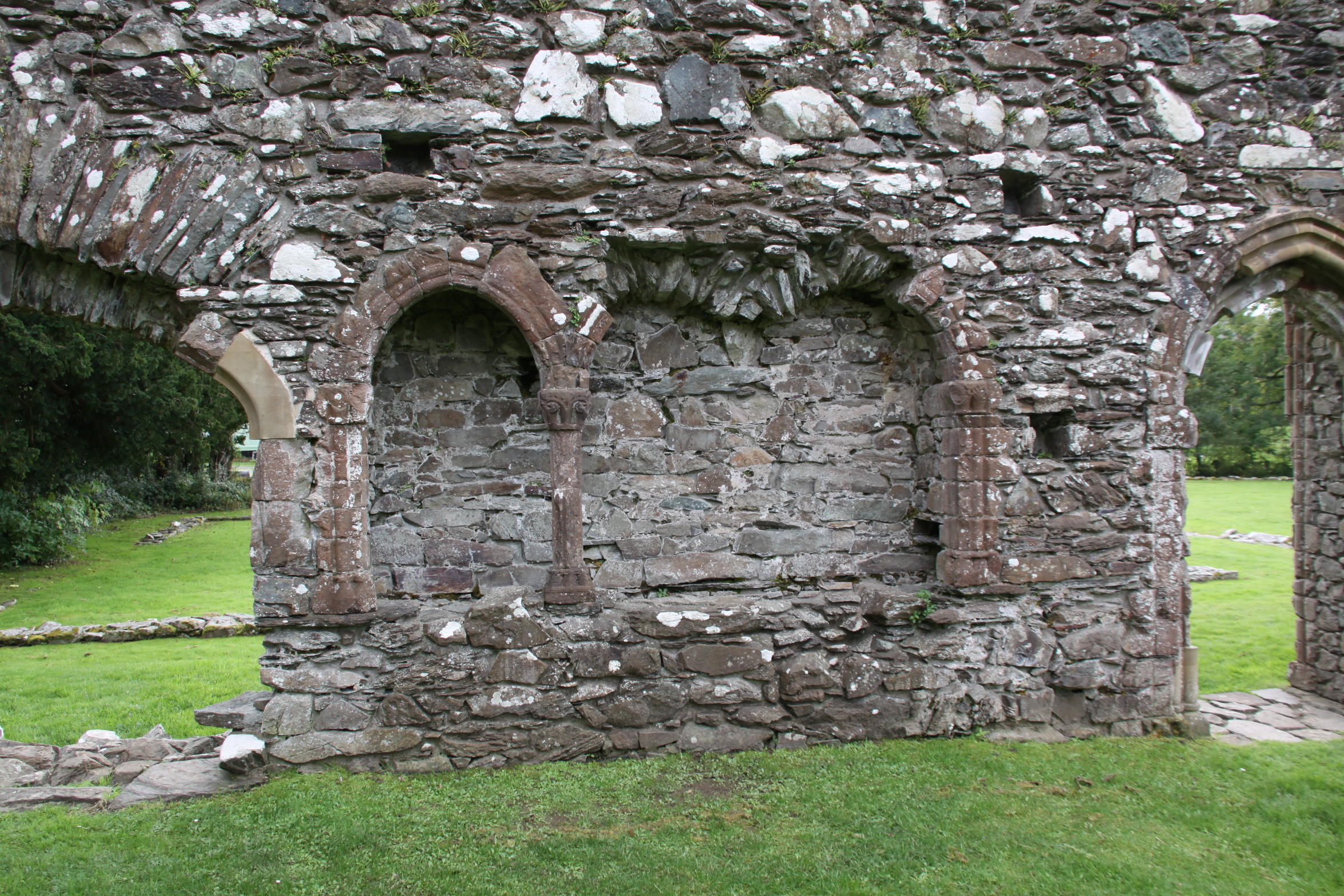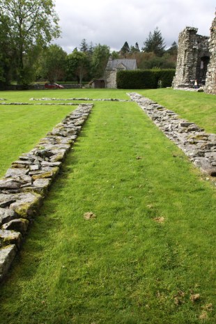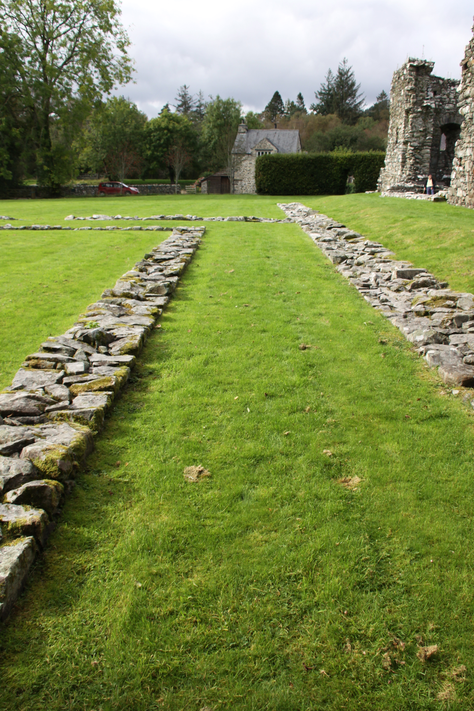 Abbeys followed a standardized plan, with a cruciform church making up one side of a four-sided complex that surrounded a square section of grass or garden (the garth). Around the garth was a walkway, usually covered, called the cloister. This connected all the buildings, and also served as a processional way. Cymer differs from the standard layout in a number of ways.