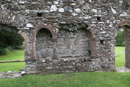 At the east end of the abbey, in the south aisle, an arched recess is provided with touches of decorative red sandstone. These touches give an idea of how the abbey achieved some degree of ornamentation without the opulence of cathedrals and Cluniac abbeys.