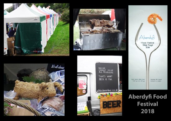 I was in Chester for most of last week with my father, but I ensured that I was back in time for the Aberdyfi Food Festival 2018, the fourth anniversary of the event, which takes place in a field, at one time the school playing field, next to the station. It was superb! It was a grey day, with drizzle, but everyone dressed up for the weather and it was packed, with a great atmosphere. There must have been about 30 stalls. Some sold food and drink in packets and bottles to take home, whilst others were providing a wide range of consumables to eat and drink on the hoof, including paella, hog roast, pizza, oysters, Pimms, cider, beer, coffee and much more. Straw bales were scattered around to sit on, and there was a marquee where events were taking place. These included: Welsh lamb at its best / Fizz Masterclass / Something fishy! / Cocktails / Foraging and syrups.