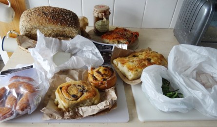 My haul from the Food Festival: seeded wholemeal bread, apple chutney, mangalitza sausages, two types of focaccia, a pain au raisin, a chelsea bun, a bag of fresh samphire and two stunning fillets of hake