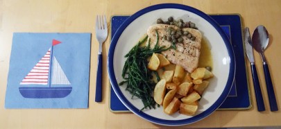 My happy efforts with Seabreeze hake fillet with steamed Seabreeze samphire, rather too many sautéed maris piper potatoes and a caper, lemon and butter sauce