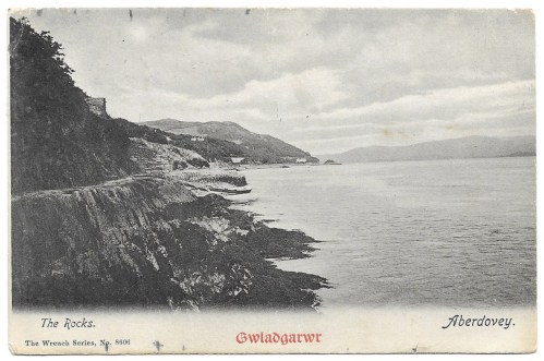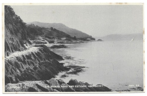 I am still unsure if this is the correct answer, as the track barely seems wide enough for horse-drawn vehicles, and in places would have been lethal underfoot for horses. One would need to see Penson’s plans for the replacement road mentioned by the Gwynedd Archaeological Trust’s report. Whatever its original purpose, it is invaluable today as a ready-made footpath for walkers. The note about the road being unpopular due to being submerged by tides holds true today. The walk is impossible without wading through water at high tide. I note that the second of the two postcards does not commit itself on the subject and states merely that the scene shows “The Rocks.”
