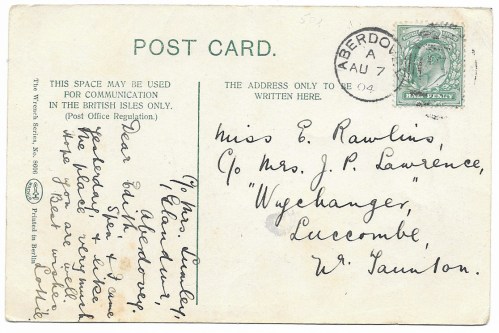 I loved the brevity of the message, which also contained the brilliant information that the sender had been staying at Glandwyr in Aberdovey. 115 years later it is owned by a very nice local holiday company, Dyfi Cottages, that lets out properties in the village and also runs the Visit Aberdovey Facebook page. There’s a lovely sense of continuity in those details. I suppose that postcards were, and still are, a form of social media, a way of maintaining communication with people far away. The postcard was sent to the beautiful village of Luccombe, which now lies in Exmoor National Park in Somerset. The house to which it was sent, Wychanger, was a manor house now Grade 2 listed and converted to semi-detached homes. It is fun to have the full breadcrumb trail.