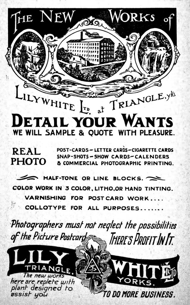 The first postcard was unused, so there are no helpful postmark or stamp details to give an indication of date. It was manufactured by Lilywhite Ltd of Triangle, Halifax. Lilywhite was set up by Arthur Frederick Sergeant (1882-1952) in around 1910 and produced postcards at least until 1931 when their factory burned down, destroying both prints and negatives. They took over Arrow Series Postcards in the 1920s and as well as retaining the Arrow name for some of their postcards, re-released some earlier Arrow postcards under the Lilywhite name. I’ll keep an eye open for a used version of this postcard to see if I can find a date or at least a date range.