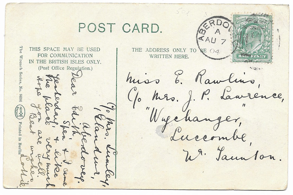 The 1902 Post Office regulations are provided as simple instructions on each half of the back of the card, leaving no room for any confusion! The title Gwladgarwr at the front of the card is a puzzle, appearing on a lot of Wrench’s Welsh postcards. It means “patriot” and was the title of a Welsh language newspaper (Yr Gwladgarwr), but the newspaper appears to have no connection with the postcard manufacturer. The card is in the Wrench Series, no.8006, and was printed in Berlin.