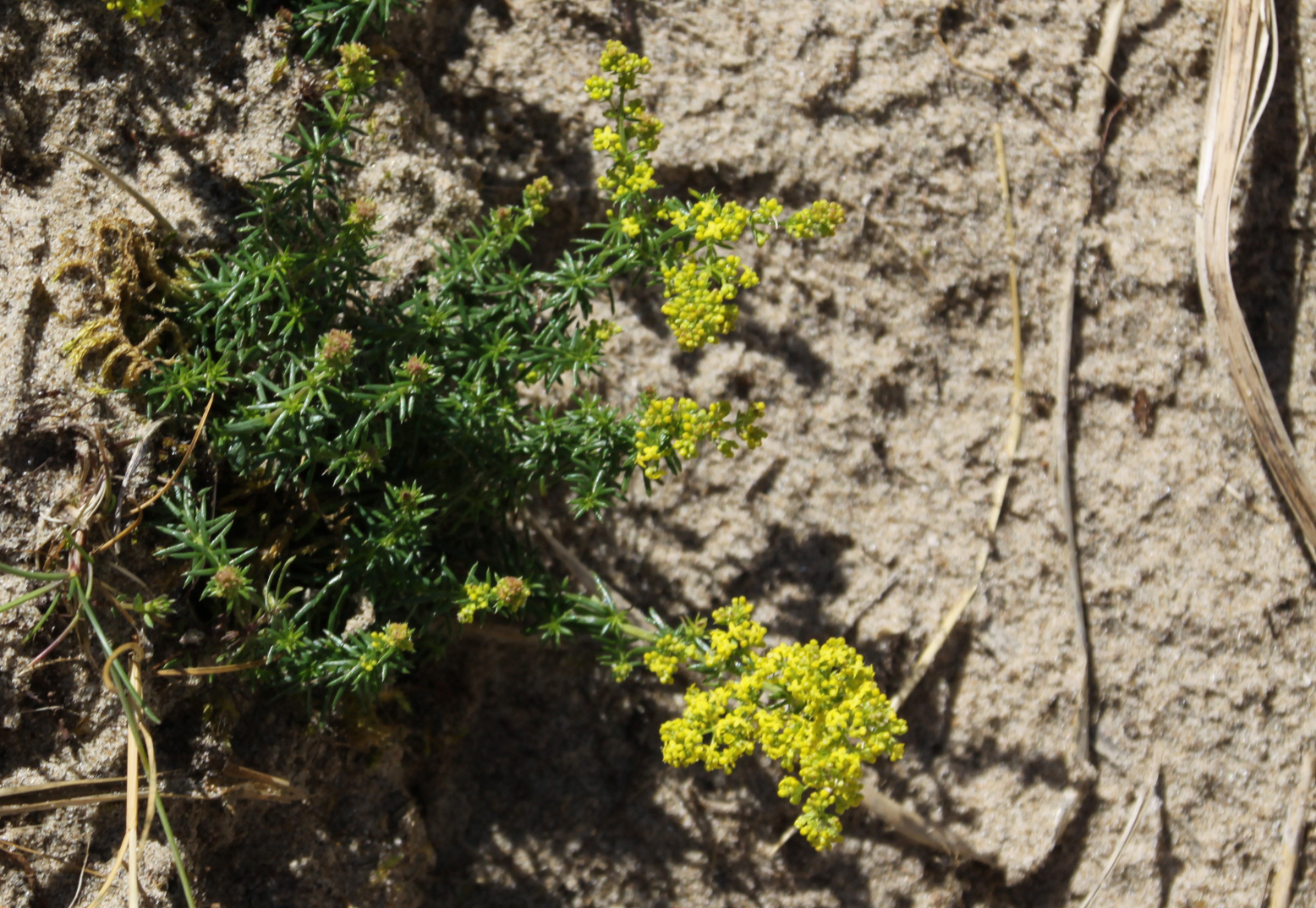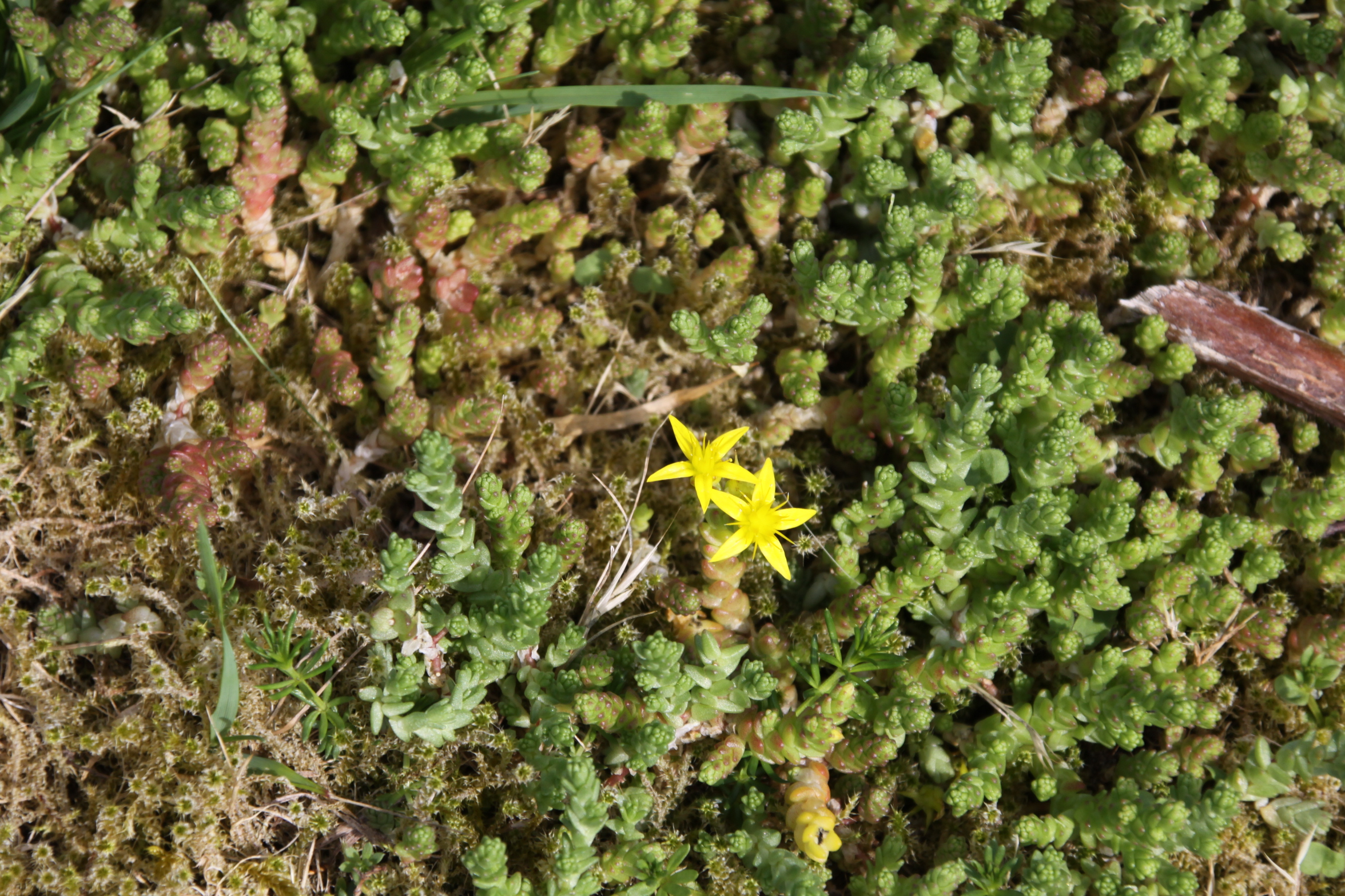 White stonecrop (Sedum album) has now spread over huge areas of the lower parts of the sand dunes, particularly near the road where the sand is mixed with soil, its succulent leaves forming mats, and its white star-like flowers clustering at the top of the short, slender stems. Drought tolerant, thanks to the succulent leaves that store water. Like Sea rocket (Cakile maritima) it has apparently benefited from the lack of people around, colonizing areas that would otherwise be used for reaching the caravan park, the golf course and the beach.