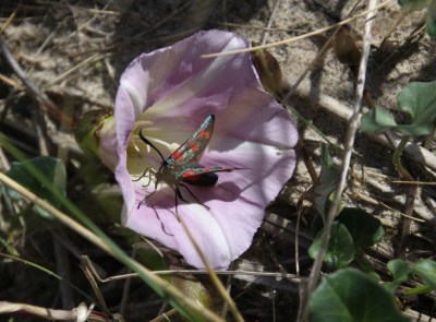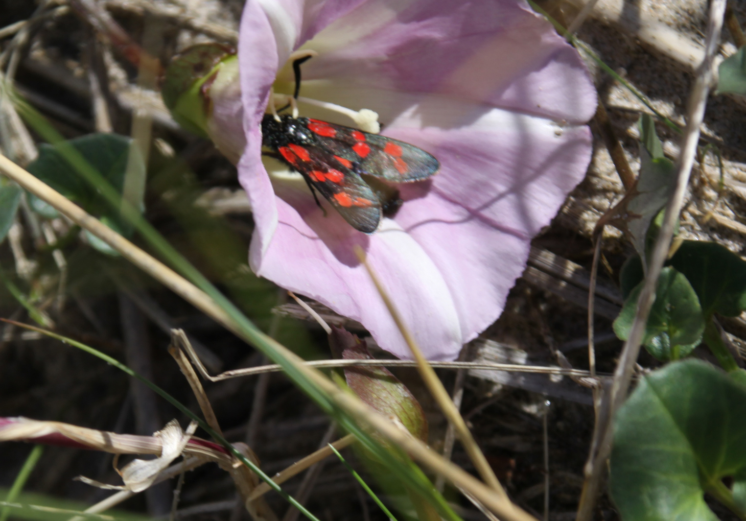 Common ragwort (Senecio jacobaea) is common in the area, in the hills, fields, wasteland, and in the dunes. It is poisonous to birds, horses and cattle, particularly when dry, but for some reason sheep seem to be immune. It may be either biennial or perennial. Although it can be mistaken for goldenrod (Solidago virgaurea) from the flower alone, the leaves are very different. Where goldenrod has long, thin leaves, common ragwort’s leaves are untidy, dissected and multiple-lobed. Senecio is almost the only specie that can be used for food by the day-flying red and black cinnabar moth’s (Tyria jacobaea) caterpillar, striped bright orange and black, absorbing the plant’s poison as a defense against birds. In spite of the fact that they can be seen between May and August, there were none on view that day.