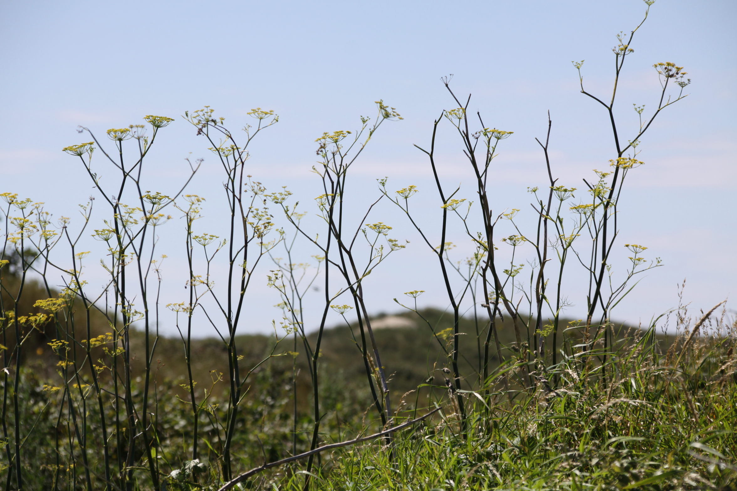 Before flowering, old man’s beard, or traveller’s joy (Clematis vitalba) looks just like clematis and is probably the next most widespread plant in the dunes after marram grass, hugging the lower lying areas. It spreads over everything, and provides a natural protective home for the wild pyramidal orchid (Anacamptis pyramidalis) that grows in the dunes. The name old man’s beard refers to the hairy, air-born seed heads that appear in autumn and extend into winter. The flower begins as a tiny, spherical white bud and bursts into lovely, starry white flowers with four white sepals and a burst of stamens.