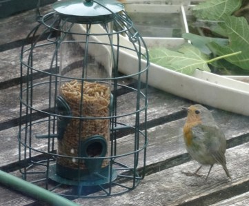 The garden was avian-central today – a blue tit, a great tit, coal tits, a robin, three female house sparrows and a male blackbird, as well as the pheasant and doves. The robin was ever-present, occasionally chasing off the sparrows, and he is increasingly vocal. Not a pretty song, but unmistakeable. The coal tits always announce their arrival by a highly distinctive peeping sound.