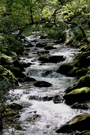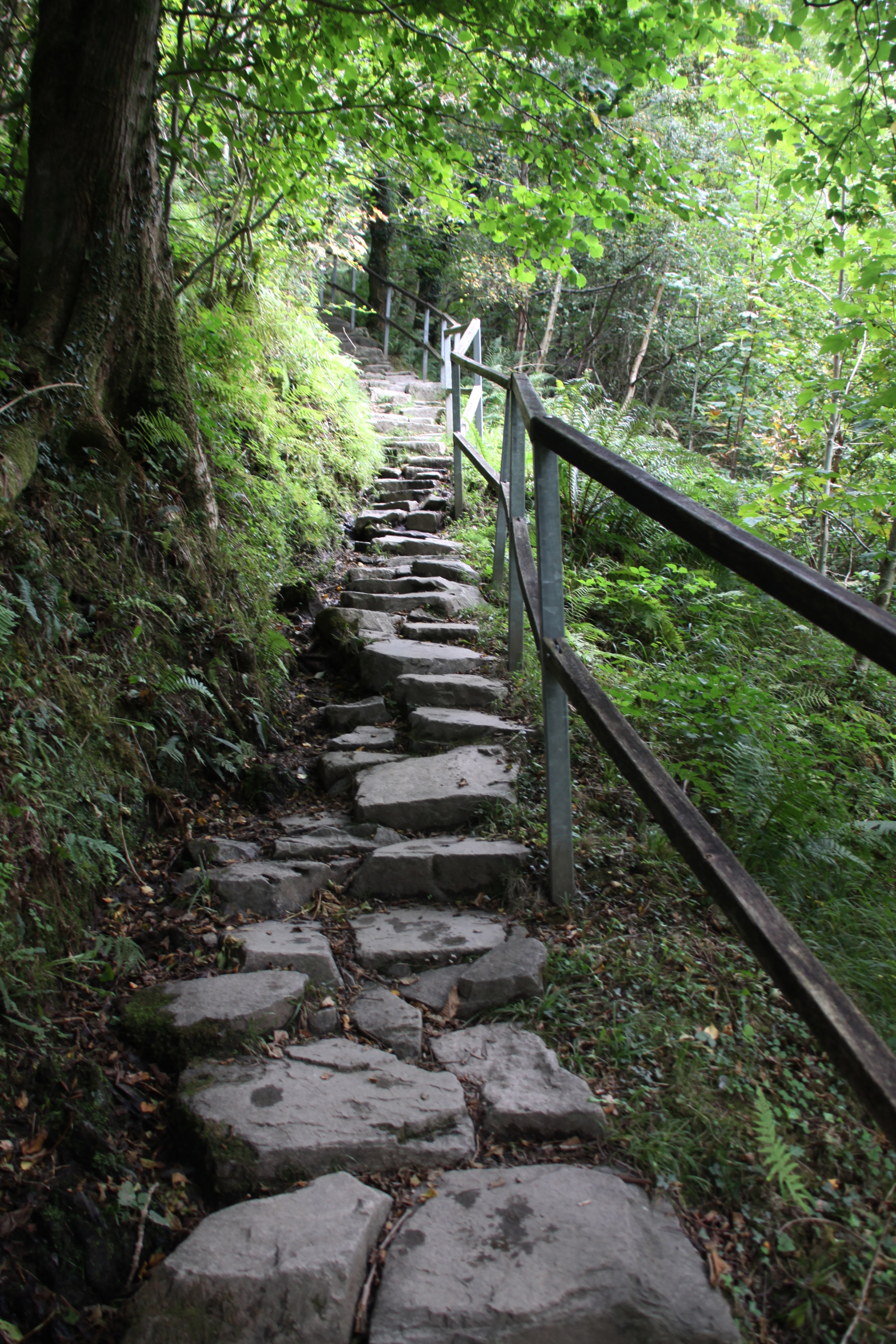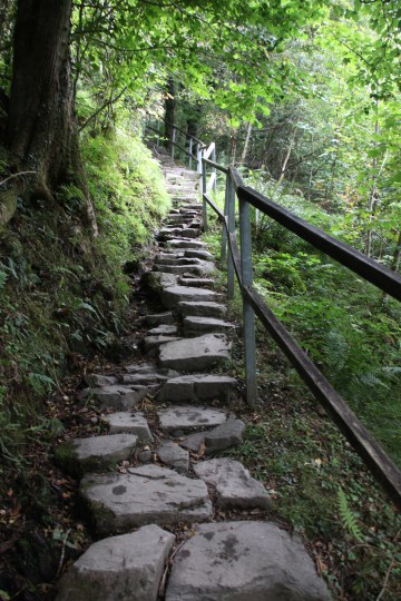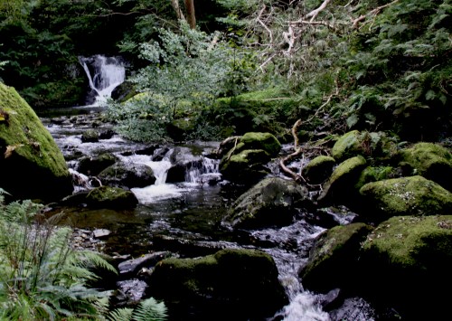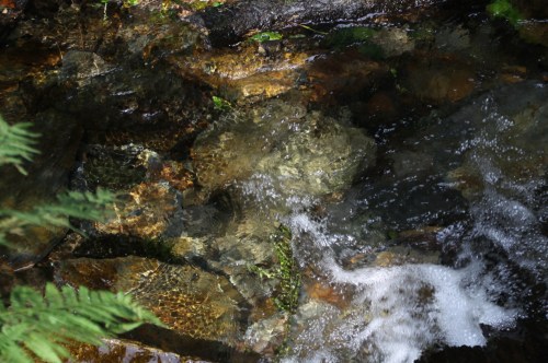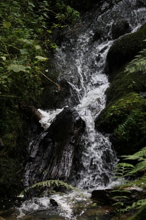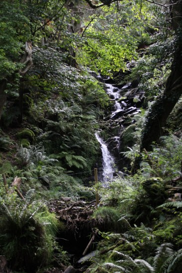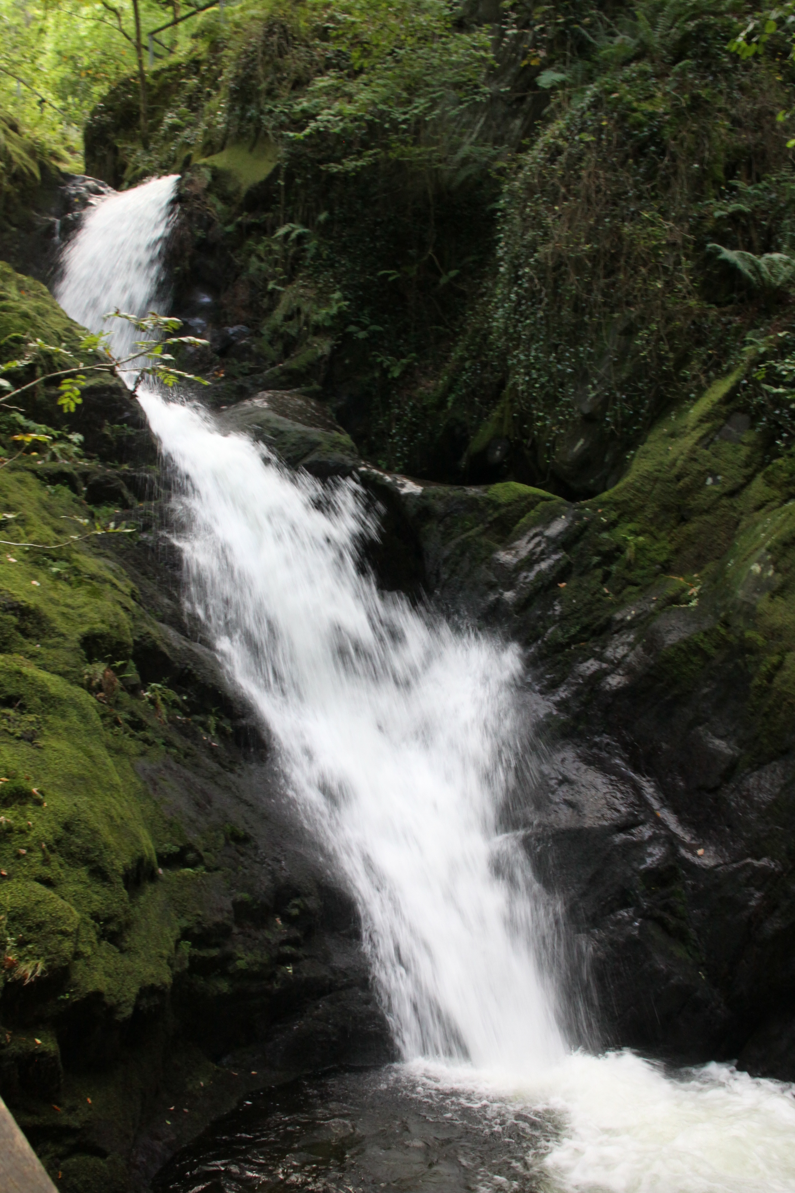 I was lucky with the weather.  I arrived at 11am in full sunshine, the car park was fairly empty, and it looked as though the day was going to heat up quickly.  I love the heat, so that’s never a problem, but for anyone who prefers a bit of cool, this is the perfect walk on a hot or stuffy day.  The valley is very steep, and its slopes are covered in trees, the sky only properly visible when you get onto the highest reaches of the walk, with hilltops flanking you.  Even on a seriously sunny summer day this means that dappled light trickles through the leaves and does wonderful things to the water, but it remains a very pleasant temperature.  Everything is vibrantly, richly green, apparently a form of heaven for botanists who specialize in plants that thrive on a combination of shade, cool conditions and humidity.  The sound of the falls is ever-present, delicious, sometimes crashing and sometimes burbling.