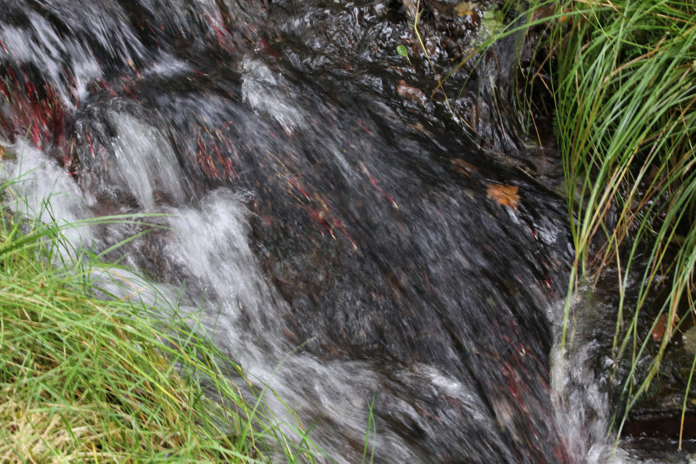 A stream plummeting down Cwm Amarch, above Pentre Farm, on the northeast side of the lake on a very rainy day in late June 2020