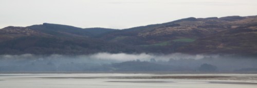 This is a poor photograph, taken through the side window of my car in a mad rush, whilst I was held up at the roadwork traffic lights on the Aberdovey to Machynlleth road, on my way to a dental appointment.  My closest friend Cheryll, to whom I emailed it, argues that I should post it in case no-one has been lucky enough to see this particular cloud formation.  So here it is, with the cloud in a thin strip hovering just above the floodplain on the opposite bank of the river Dfyi, with apologies for the poor quality.  I don’t know what this type of cloud formation is called (if anyone knows, please do let me know), but it happens around here quite often.  This, however, was the first time I have driven alongside it along the estuary and river all the way from Aberdovey to Machynlleth.  It was an amazing sight.  Every time I glimpsed right (south), it was still there in the 20 or so minute drive some time between 1120 and 1145.  So here’s the photo, and please remember to blame Cheryll if you don’t like it!  By the time I was driving back to Aberdovey it had evaporated completely.