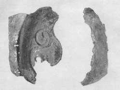 The hoard consisted of thin decorative sheeting made of copper alloys, all bound closely together.  When it was inspected, it was found to look less like a ceremonial deposit than a stash deposited for later collection.  In Savory’s words “the metalwork had evidently once decorated at least two different shields and possibly various other objects as well, it must have been dismantled and packed together as scrap-metal before being deposited under the boulder.”  The shield pieces were decorated with vertical ribs and curvilinear plaques that flanked a central shield boss (a knob set in a circular, often decorated plate) all of which had been riveted on to a wooden or metal shield.   A more fragmentary shield boss was also found in the hoard, as were two trapezoid plaques that don’t appear to connect directly to the other finds, four composite discs that had been riveted to a surface that was “probably not a shield but a bier or ceremonial vehicle,” and another, plain disc.