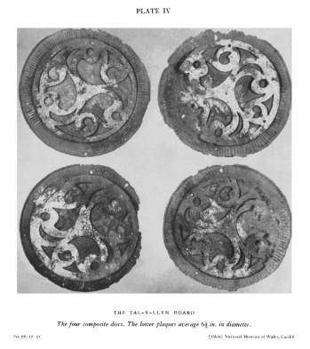 The four composite discs each consist of two pairs of metal pieces, with diameters of 5.5 (the upper) and 6.5 inches (the lower) respectively, one attached to the other with rivets.  Each disc in the pair was decorated, the smaller brass-coloured disc with an open-work pattern and the larger with La Tène curvilinear patterns, the larger with a decorated hollow rim into which the smaller disc is inserted, its surface covered by tin beneath the smaller disc, visible through the open pieces on the bigger disc, providing a contrast of colours.  They were attached to another, large flat surface by rivets, but it is not clear what.  The open-work pattern and the “whirligig triskele with lashing tendrils or streamers attached to its limbs” again reference continental designs, although Savory says that the streamers are a uniquely British addition to the motif.