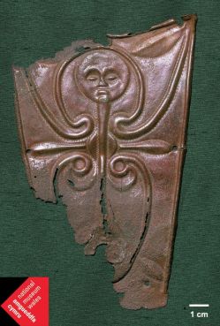 The two trapezoid plaques are remarkable and have few parallels anywhere in Britain.  They are both 6 inches long and 4.1 inches wide at the top and 2.3 inches wide at the base, framed with embossed moulding.  They are made of a thin copper and and zinc alloy with only faint traces of tin and contain hole for rivets.  They are decorated with opposed human heads, top and bottom, sharing a neck, resembling continental examples.  The function of the plaques remains unknown.