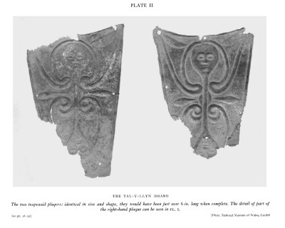 Megaw suggests that the faces on the trapezoidal plaques are far from benign and represent severed heads, an appropriate image for a warrior society.  Waddell has considered the Tal-y-Llyn hoard in terms of solar imagery, specifically the journey of the sun through the night sky, often associated with a solar boat, a concept perhaps more familiar from ancient Egypt.  For those who wish to explore this interpretation, his paper “The Tal-y-Llyn plaques and the nocturnal voyages of the sun” is available online.
