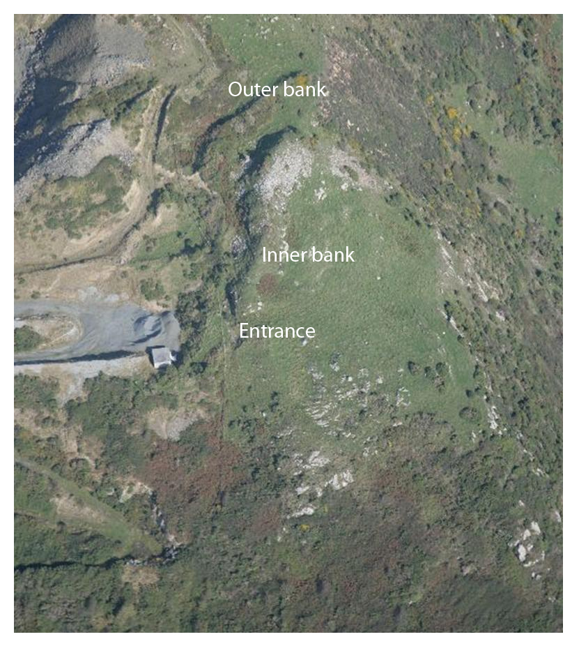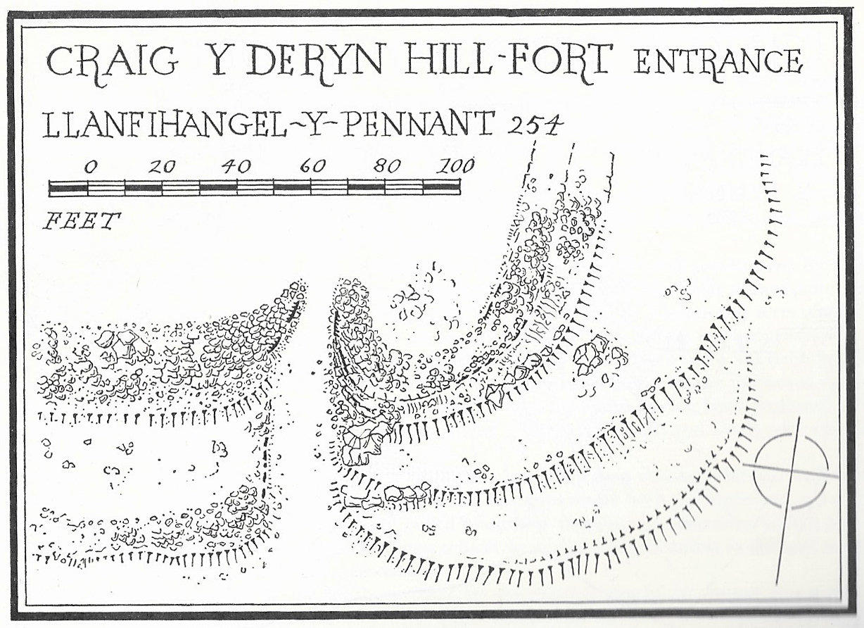 The defenses have something in common with Craig yr Aderyn, which has similar wide, sloping rock-faced banks, but the entrance is more complex, the interior more open, and the siting completely different.