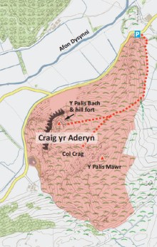 Craig yr Aderyn is a highly visible local landmark in the Dysynni valley (SH643068), and is approached by small B-roads from Bryncrug or Abergynolwyn.  For full details of reaching Craig yr Aderyn and the route up, see my other post, about the walk rather than the hillfort.